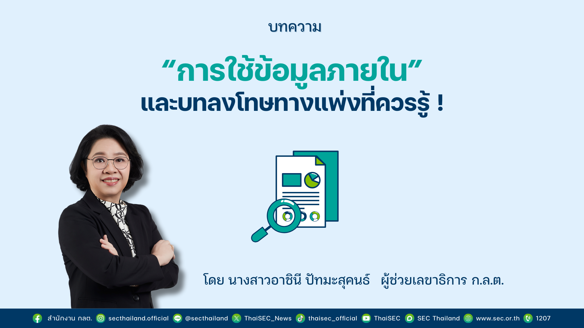 จากบทความ "การใช้ข้อมูลภายใน และมาตรการลงโทษทางแพ่งที่ควรรู้" โดยนางสาวอาชีนี ปัทมะสุคนธ์ ผู้ช่วยเลขาธิการ สำนักงานคณะกรรมการกำกับหลักทรัพย์และตลาดหลักทรัพย์ (ก.ล.ต.)  ในคอลัมน์ "“ชวนคิด ชวนคุย กับ ก.ล.ต.” เว็บไซต์ข่าวหุ้นธุรกิจออนไลน์