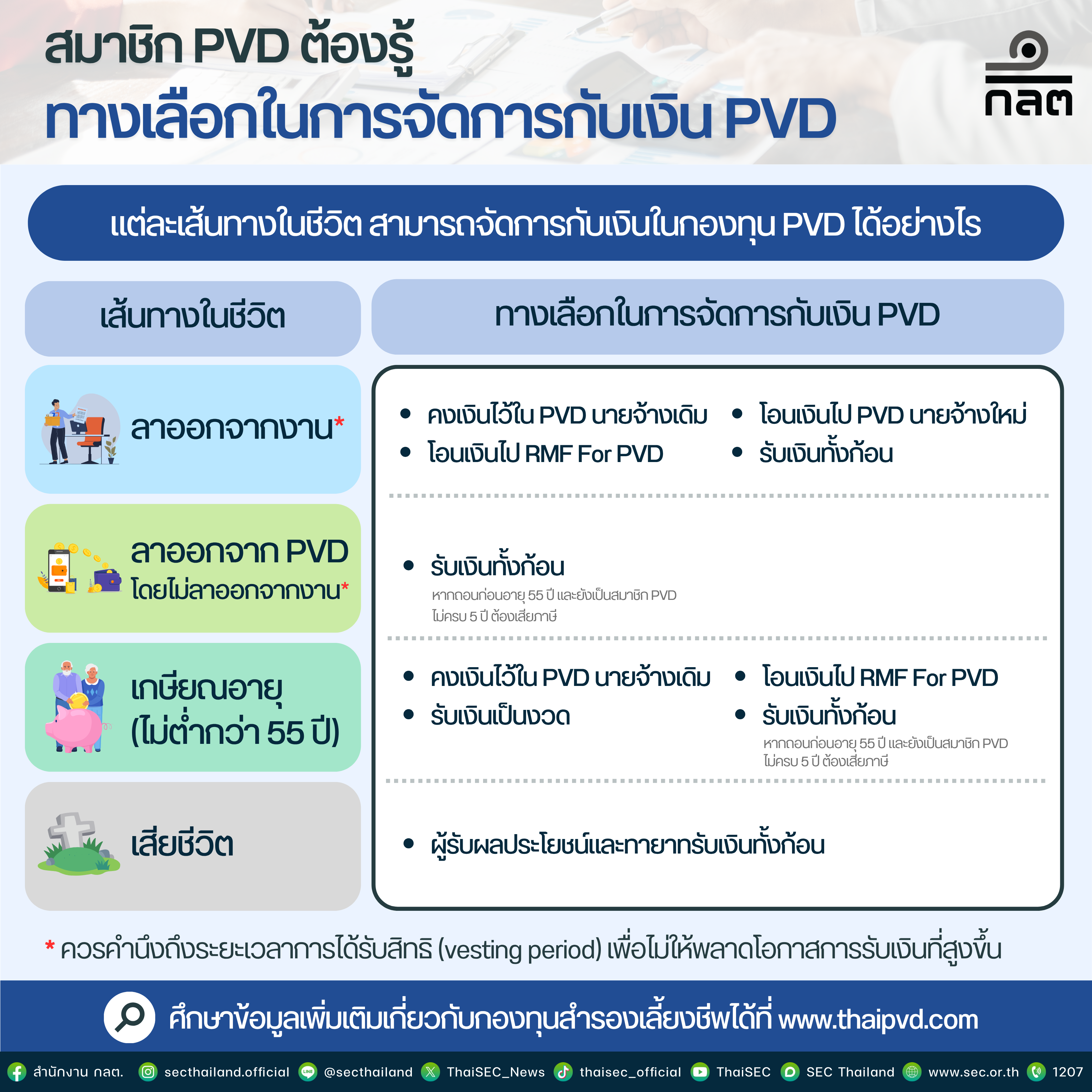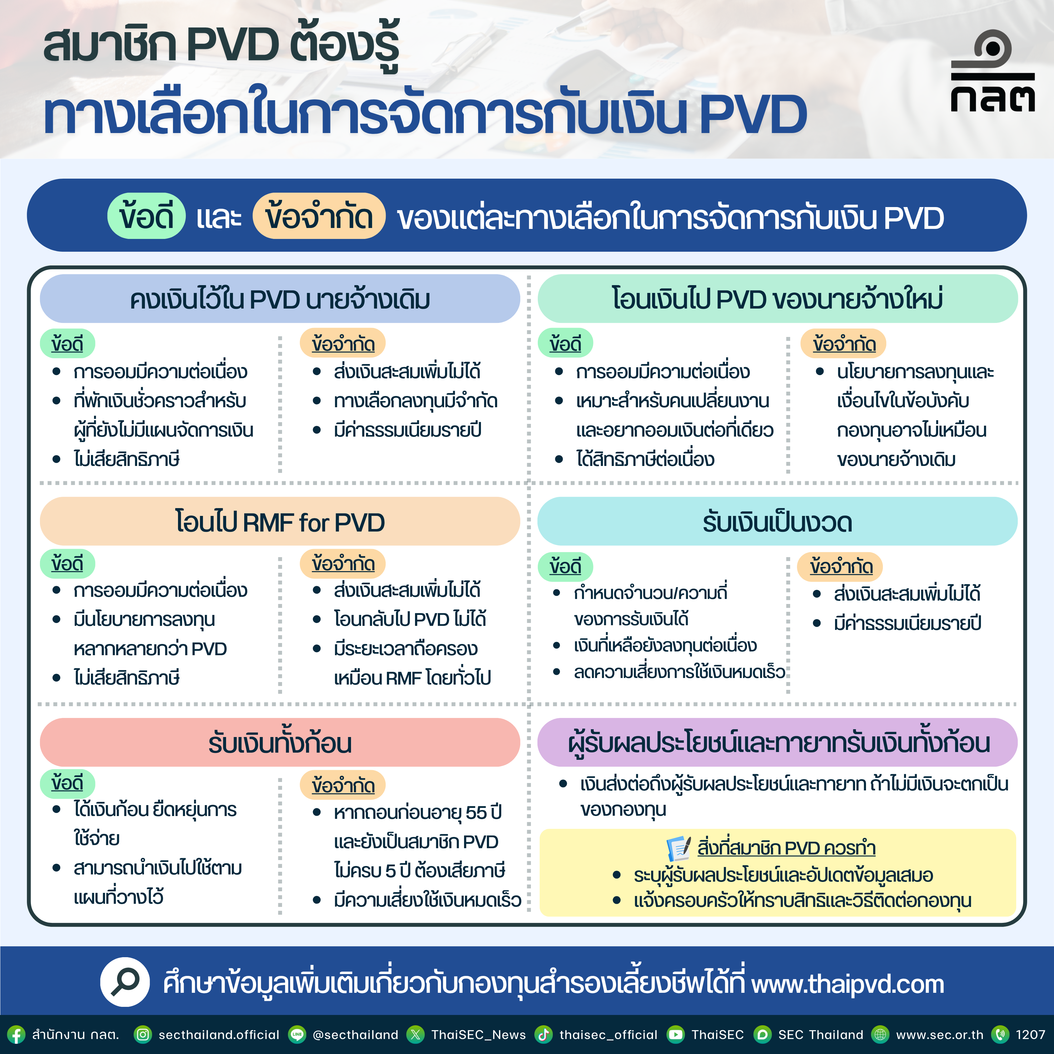 ทุกท่านสามารถอ่านข้อมูลเพิ่มเติมได้ที่ Infographic ที่สรุปมาให้แล้ว ทั้งทางเลือกการจัดการเงิน PVD และ ข้อดี VS ข้อจำกัด ของทางเลือกแต่ละประเภท เซฟเก็บไว้ได้เลย