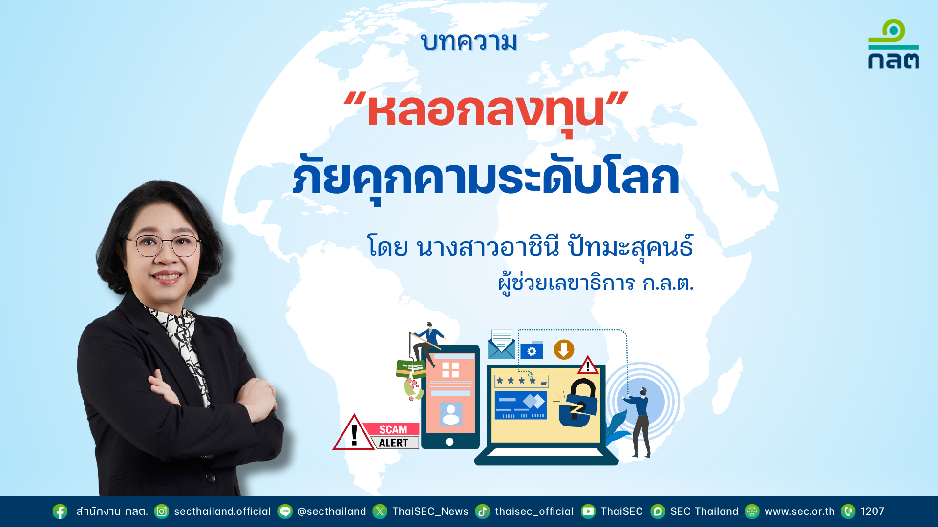 ในโลกของการลงทุนในยุคดิจิทัล แม้ว่าจะสร้างความสะดวกมากมายให้กับผู้ลงทุน แต่ในอีกด้านหนึ่ง กลับเป็นช่องทางที่มิจฉาชีพใช้ในการแสวงหาผลประโยชน์อย่างแยบยล โดยเฉพาะผ่านช่องทางออนไลน์ ที่ปัจจุบันมิจฉาชีพใช้เป็นแหล่ง “หลอกลงทุน” และไม่ได้เป็นปัญหาเฉพาะในไทยเท่านั้น แต่หลาย ๆ ประเทศก็เผชิญกับปัญหาภัยหลอกลงทุนเช่นกัน ซึ่งถือว่าเป็นความท้าทายของหน่วยงานกำกับดูแลตลาดทุนทั่วโลก