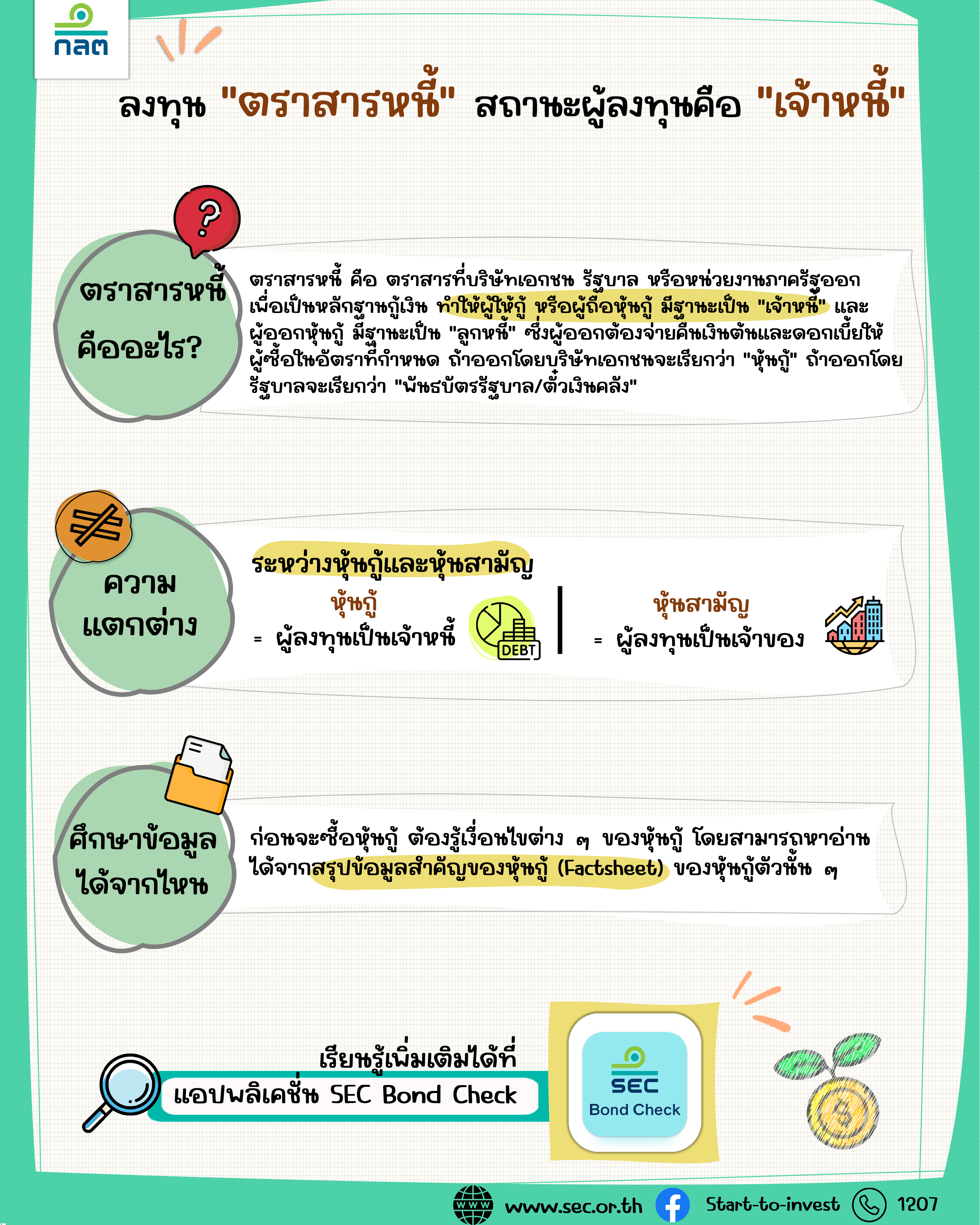 - หุ้นกู้: ผู้ลงทุนมีสถานะเป็นเจ้าหนี้