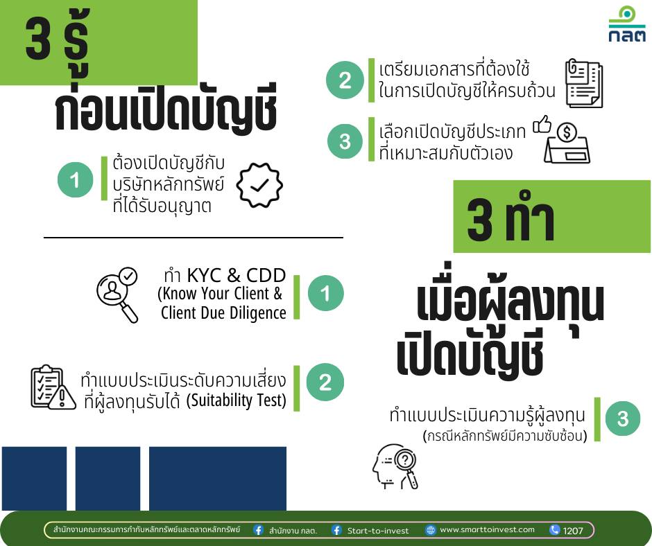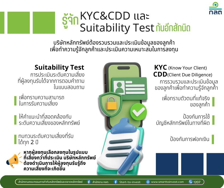เมื่อผู้ลงทุนเปิดบัญชีต้องมีการทำแบบประเมินความรู้ผู้ลงทุนด้วยการทำ KYC (Know Your Client)/CDD (Client Due Diligence) และ Suitability Test ซึ่งเป็นเกณฑ์ที่ถูกกำหนดโดย สำนักงานคณะกรรมการกำกับหลักทรัพย์และตลาดหลักทรัพย์ (ก.ล.ต.) เพื่อคุ้มครองนักลงทุน และช่วยให้แน่ใจว่าผู้นักลงทุนได้รับคำแนะนำที่เหมาะสมกับระดับความรู้และความเสี่ยงที่รับได้