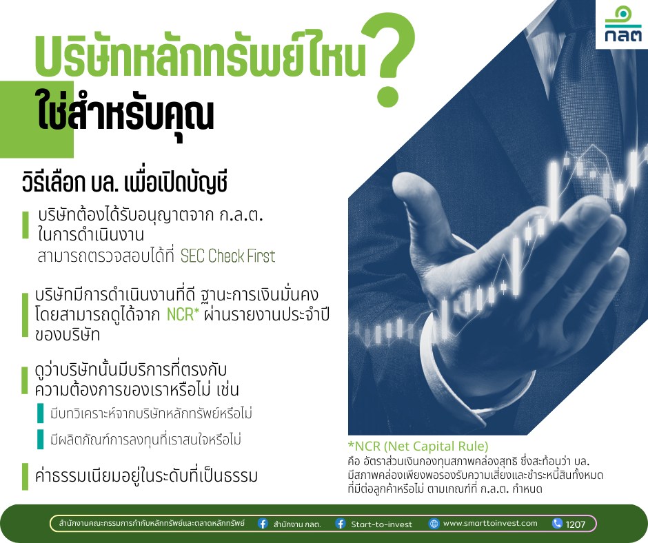 บล. ที่จะเปิดบัญชีด้วยต้องได้รับใบอนุญาตจาก ก.ล.ต. โดยสามารถตรวจสอบได้ที่ SEC Check First และควรเลือก บล. ที่มีการดำเนินงานที่ดี ฐานะการเงินมั่นคง มีบทวิเคราะห์หลักทรัพย์ มีผลิตภัณฑ์การลงทุนที่เราสนใจรวมถึงค่าธรรมเนียมที่เป็นธรรม